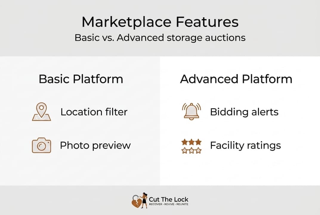 A storage unit marketplace is an online platform where storage facilities list units for auction after tenants fall behind on rent. Once a facility follows the required legal steps, including sending notices and waiting out a grace period, the unit's contents are sold to the highest bidder. The original tenant loses access. The buyer gets everything inside.