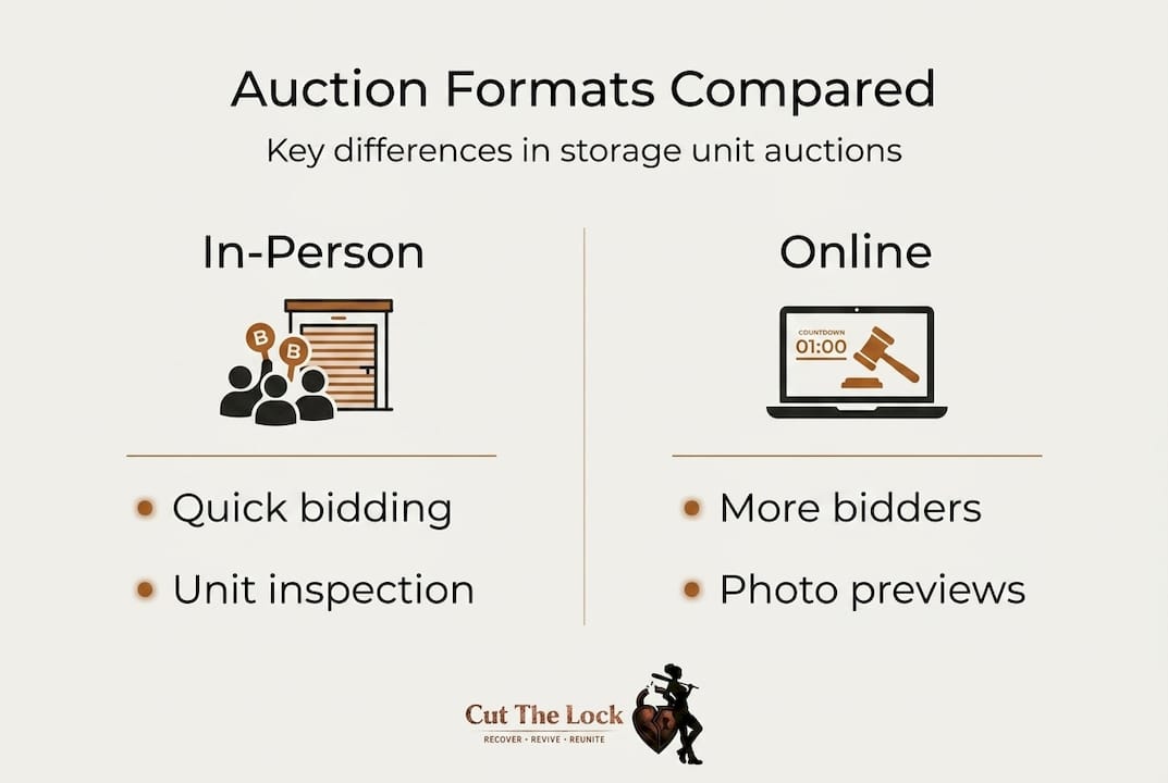 Online auctions allow remote bidding through platforms like StorageTreasures but limit physical access to photos and videos. In-person auctions allow direct viewing and even smell tests for mold, giving experienced bidders an edge that no image can provide.